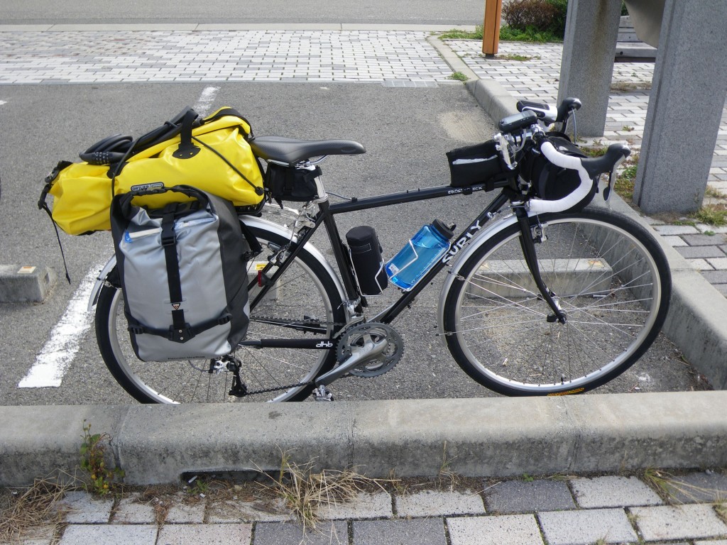 準備して半時計まわりで行くことにして、スタート。いきなりトラブル発生。荷物を積むとフレームがたわむせいかフェンダーがタイヤと干渉する。若干調整したがダメだった。きこきこ言わせながら北淡震災記念公園まで到着。そこでびわソフト。