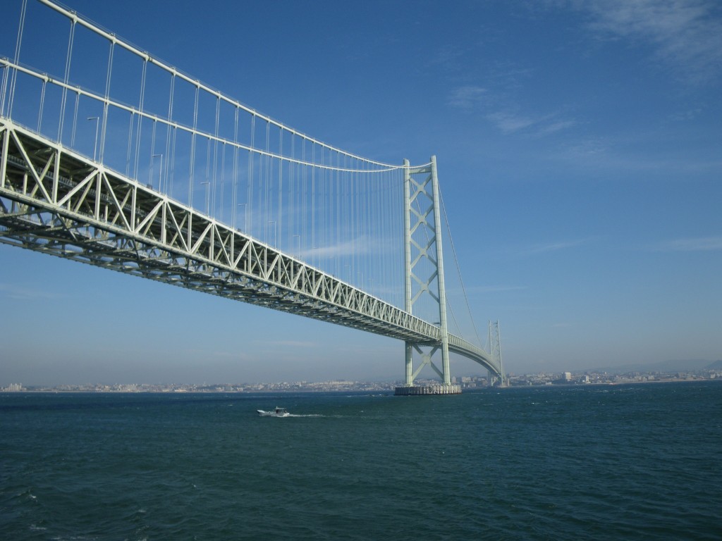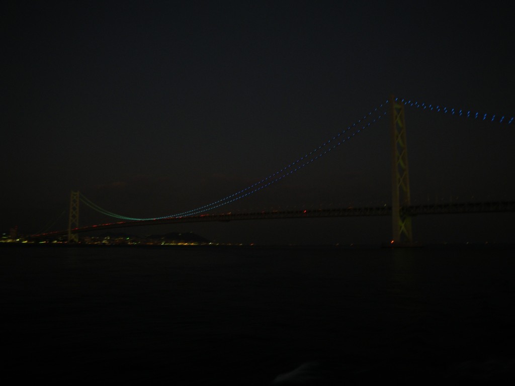 たこフェリーに乗船。明石海峡大橋は渋滞しているのが見てとれた。
