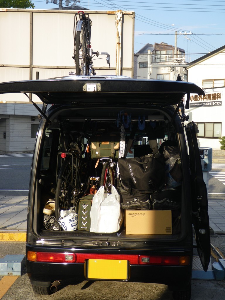 金曜の夜にNと広島を出発。前泊でKさんちに泊めてもらって、朝出発。キャンプ道具込みだと、3人3台ではキャリアに1台積んでこれでいっぱいいっぱい。
