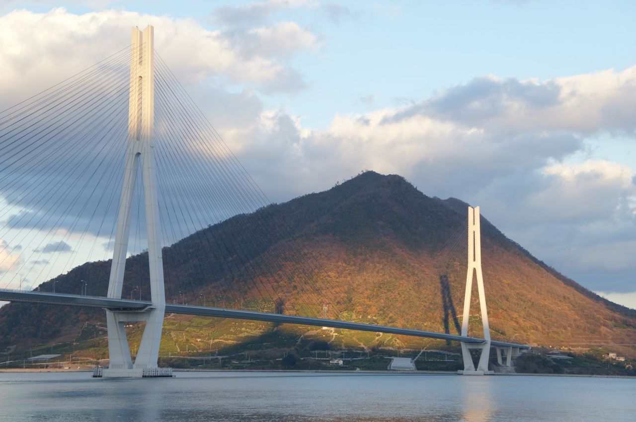 多々羅しまなみ公園では、生口島に影を落とす多々羅大橋。めずらしい。缶バッジの交換とジオキャッシング。たきびこさんが発見!
