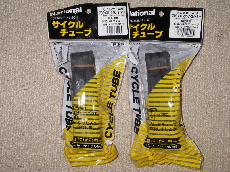 チューブはショップで適当にお願いしておいたらスタンダードなパナレーサーのチューブが箱に入ってた。で、よくみると700x31C〜34Cって書いてある。うちのタイヤは35Cだけど・・・。まぁ大丈夫??